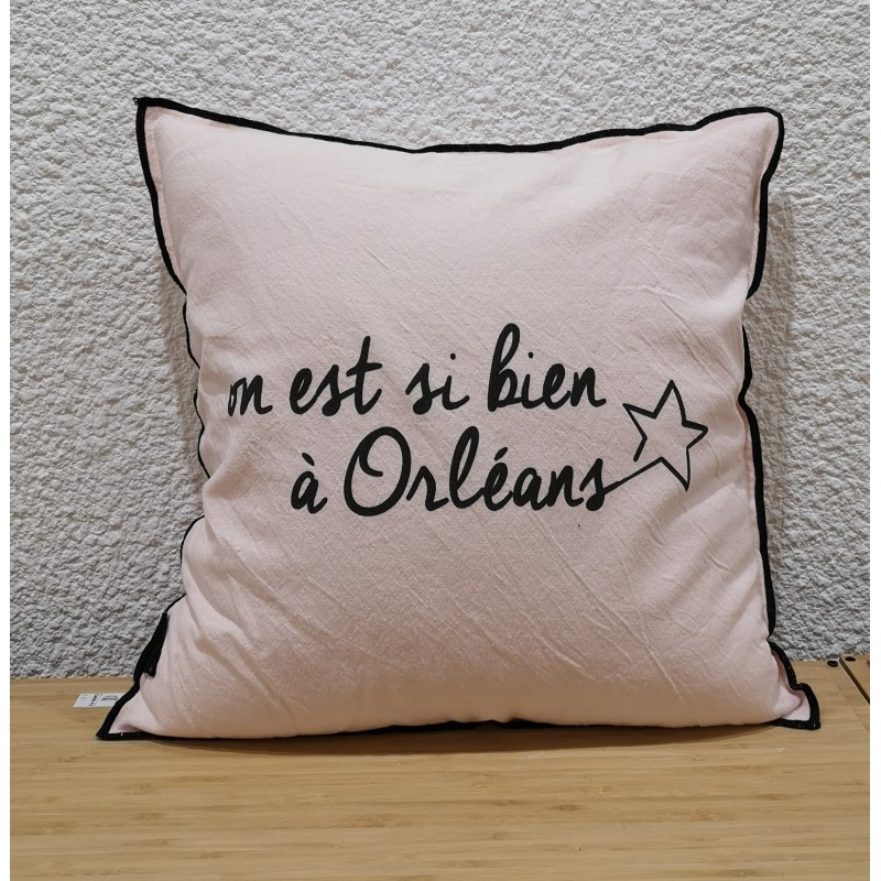 Coussin de la marque SOPHIE JANIERE à l'efigie d'Orleans avec le phrase suivante :